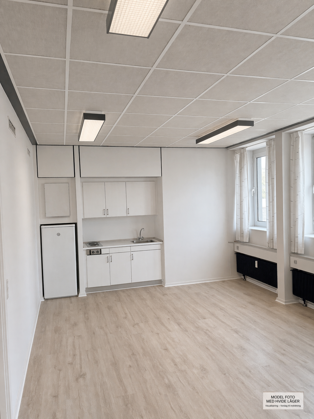 Der er mulighed for tilpasning af lejemålet efter nærmere aftale med udlejer, herunder eksempelvis opdatering af køkkenfaciliteter. Visualiseringer i materialet viser forslag til indretning.