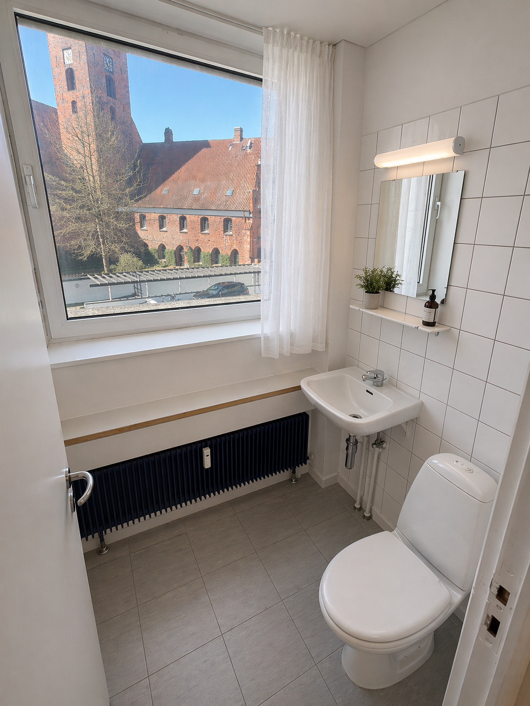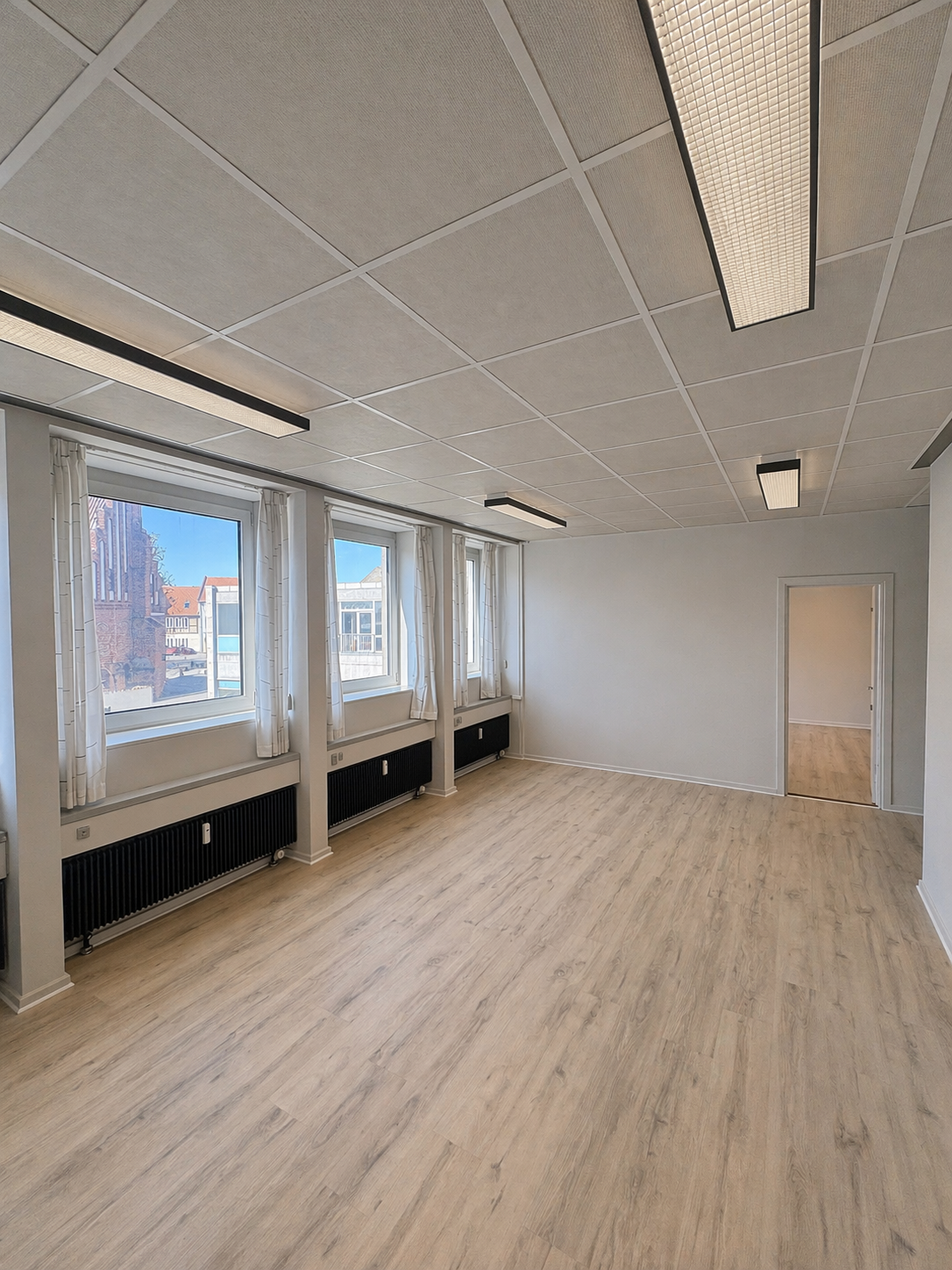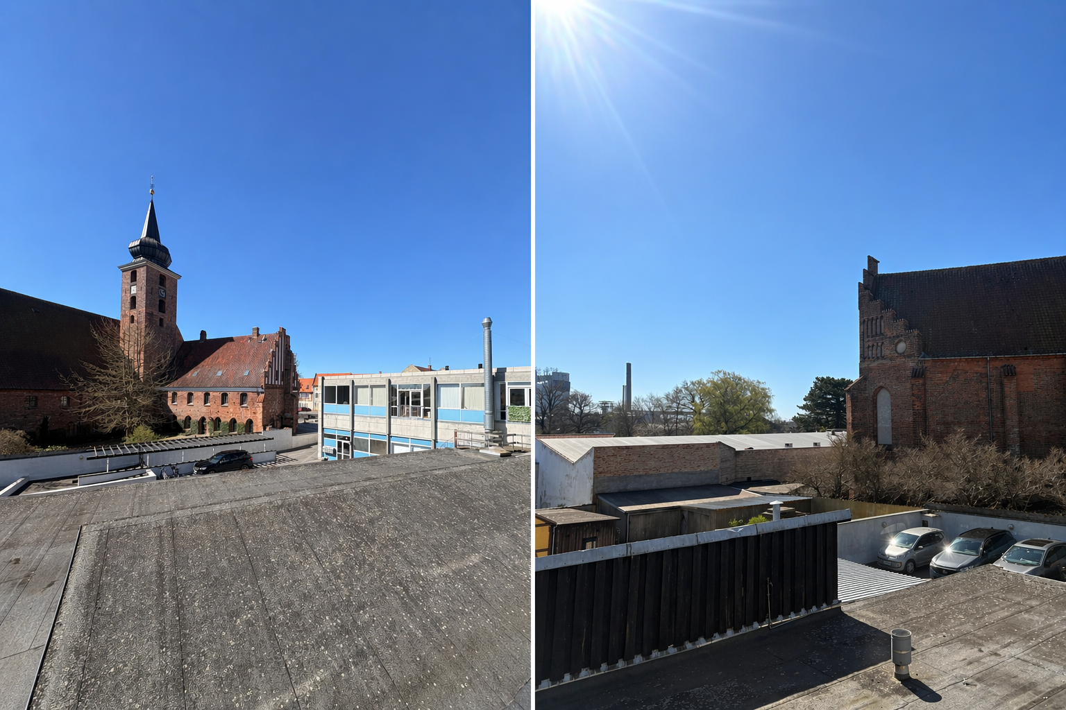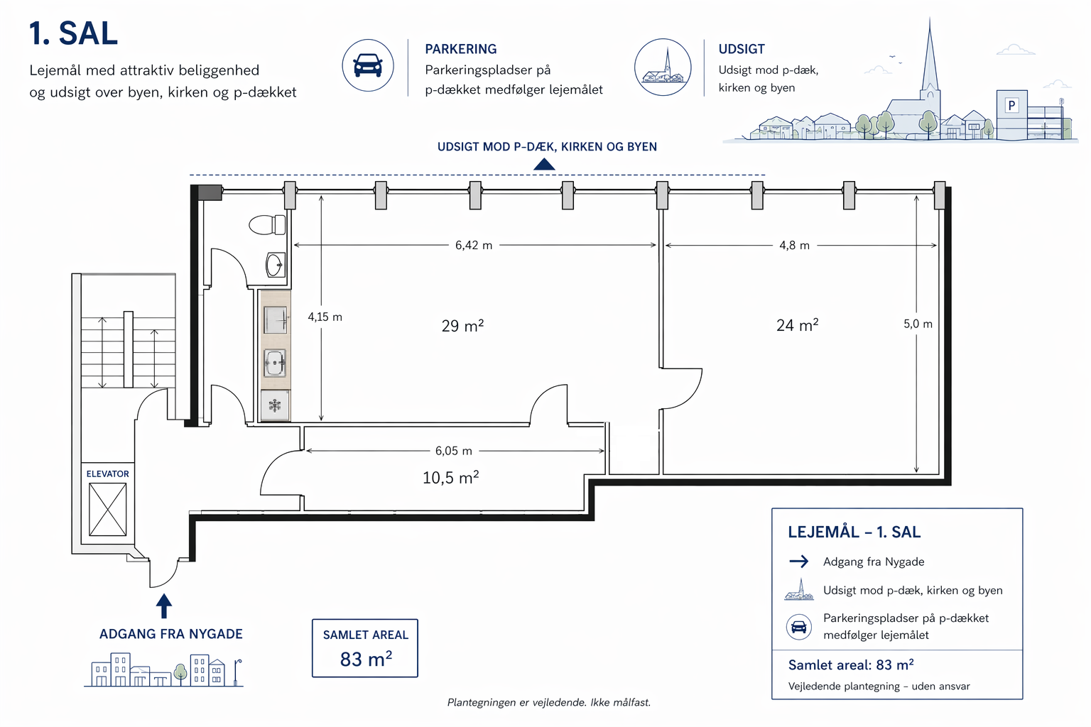 Fra lejemålet er der en fin udsigt mod p-dækket samt over byen og kirken, hvilket bidrager til et lyst og åbent arbejdsmiljø.